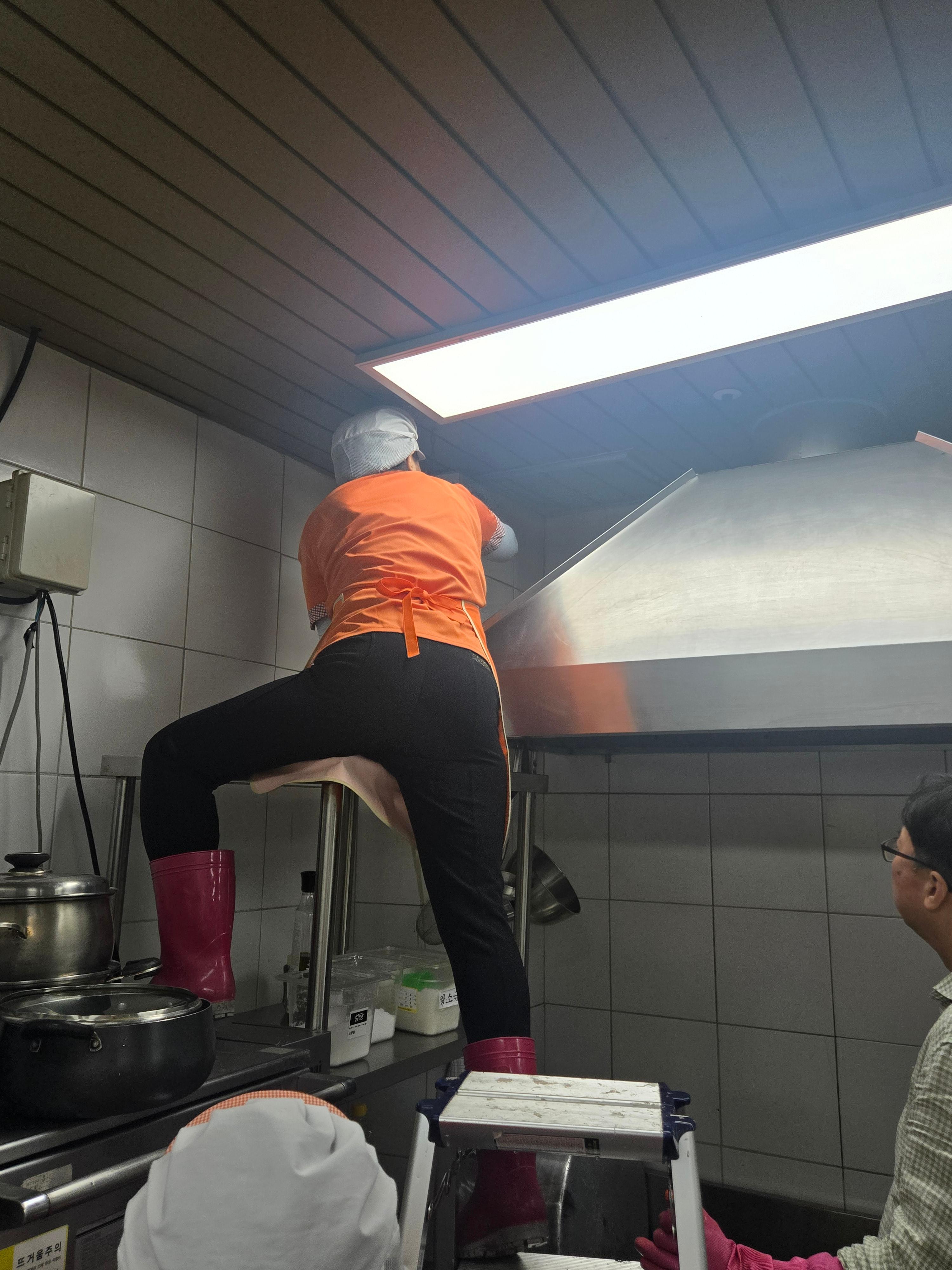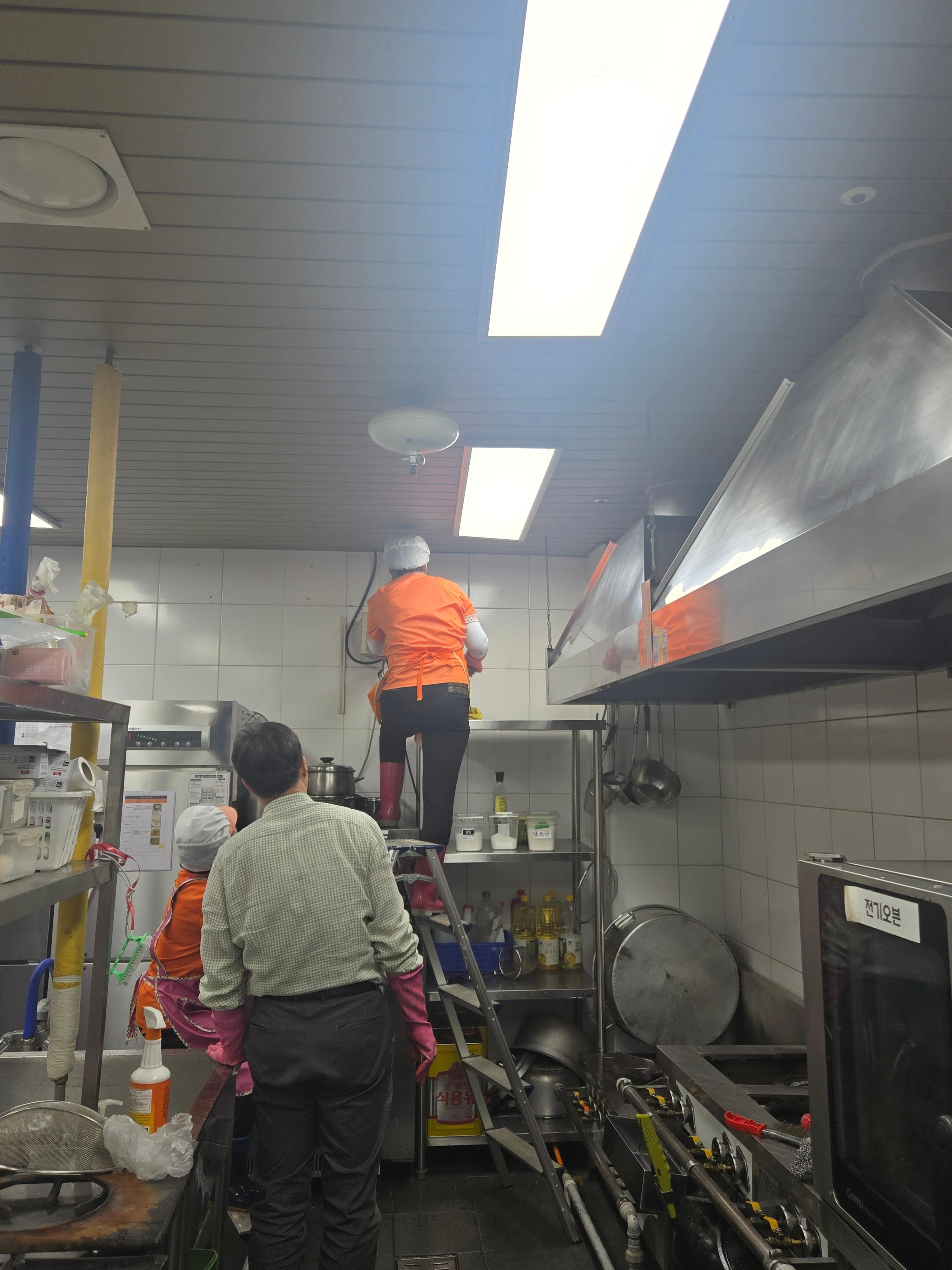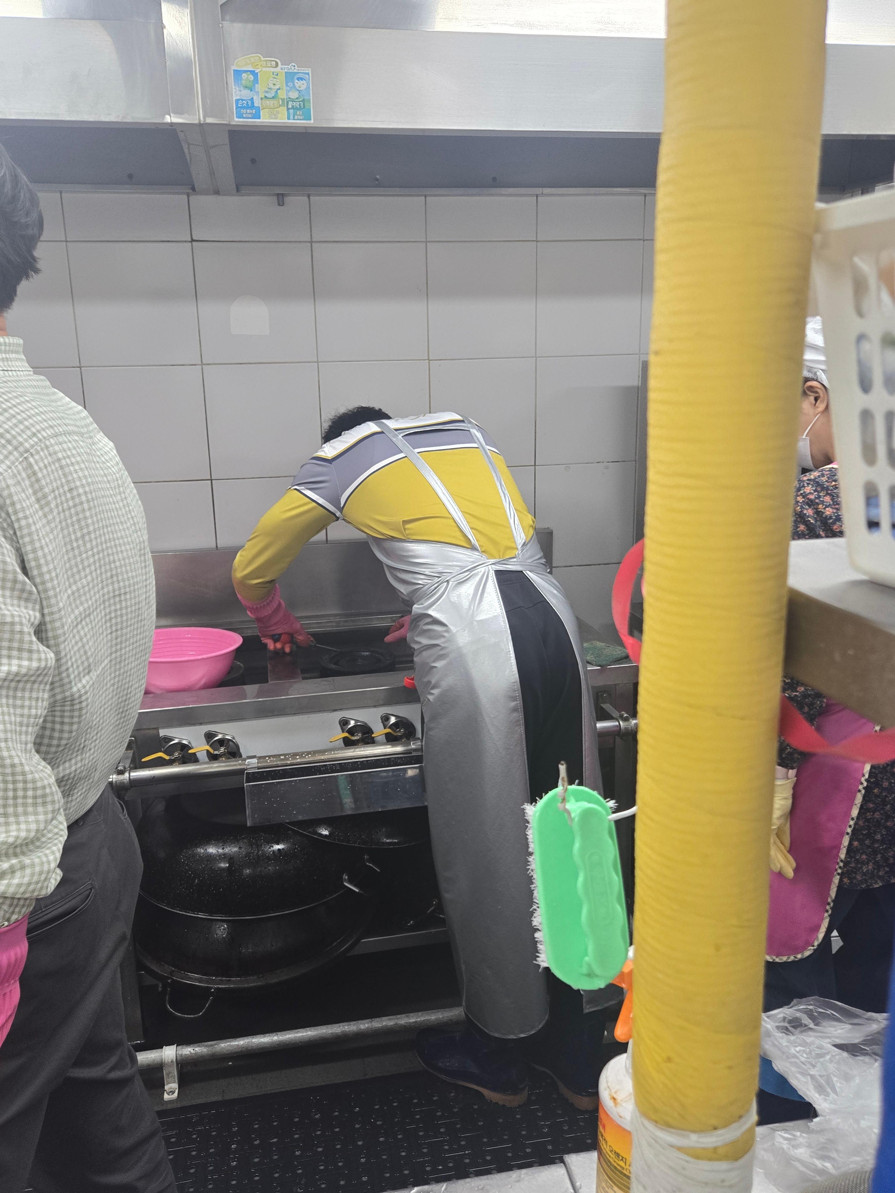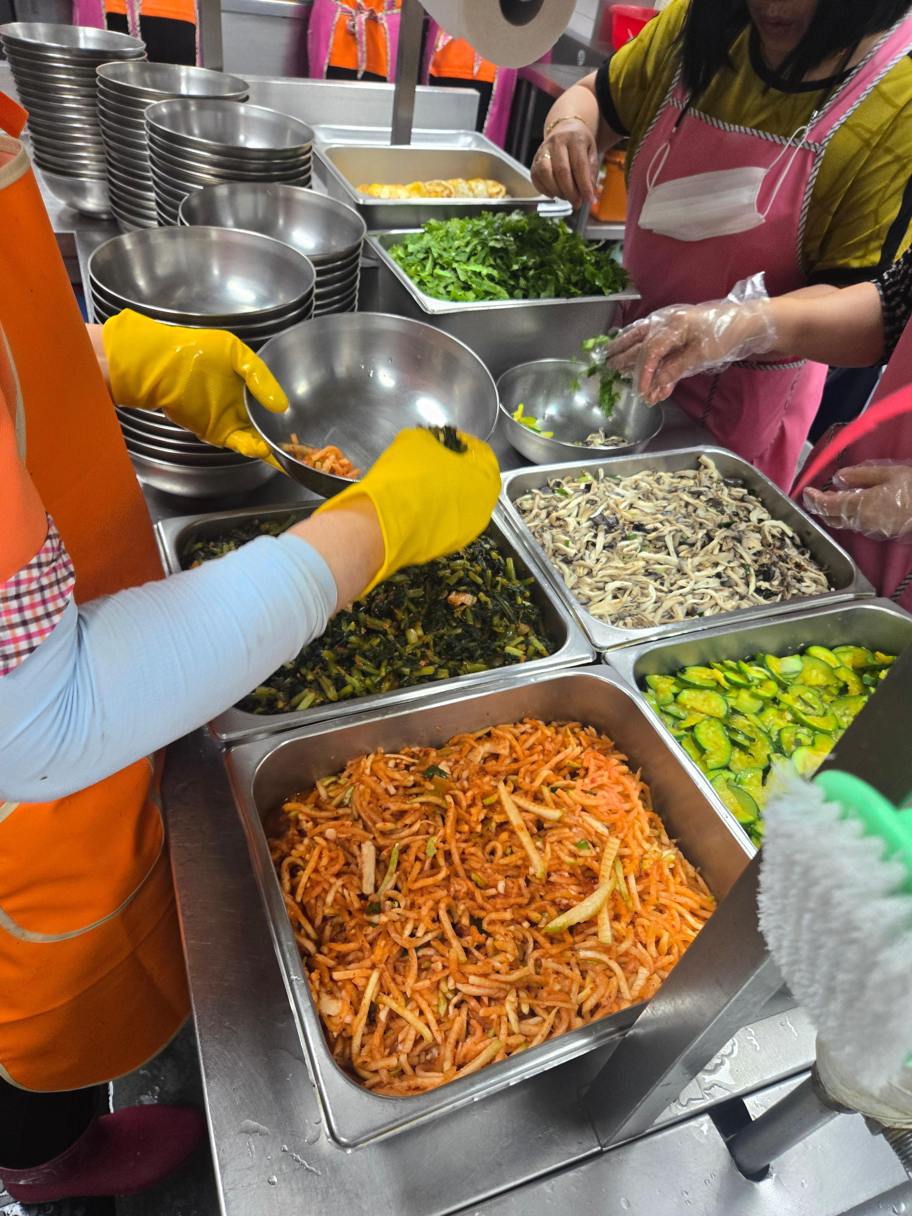 비빔밥은 인기메뉴 중 한가지예요 처음 복지관에 왔을땐 야채를 많이 드리면 좋아하실줄 알고 여러가지 나물을 많이 드렸는데 잔반이 엄청나더라구요 비빔밥에 꼭 들어가는 콩나물도 저흰 넣지 않습니다 질겨서 비빔밥에 넣으면 콩나물만 잔반으로 남더라구요 직원들은 나물을 듬뿍 넣어서 세팅하지만 어르신들은 적당한 양만 세팅해서 제공~ 간식류를 수제로 제공하고 싶었지만 보건소와 구청 점검이 얼마 남지 않아 대청소를 하는걸 선택했습니다 열정적으로 청소하시는 조리장님 수고하셨어용~~~