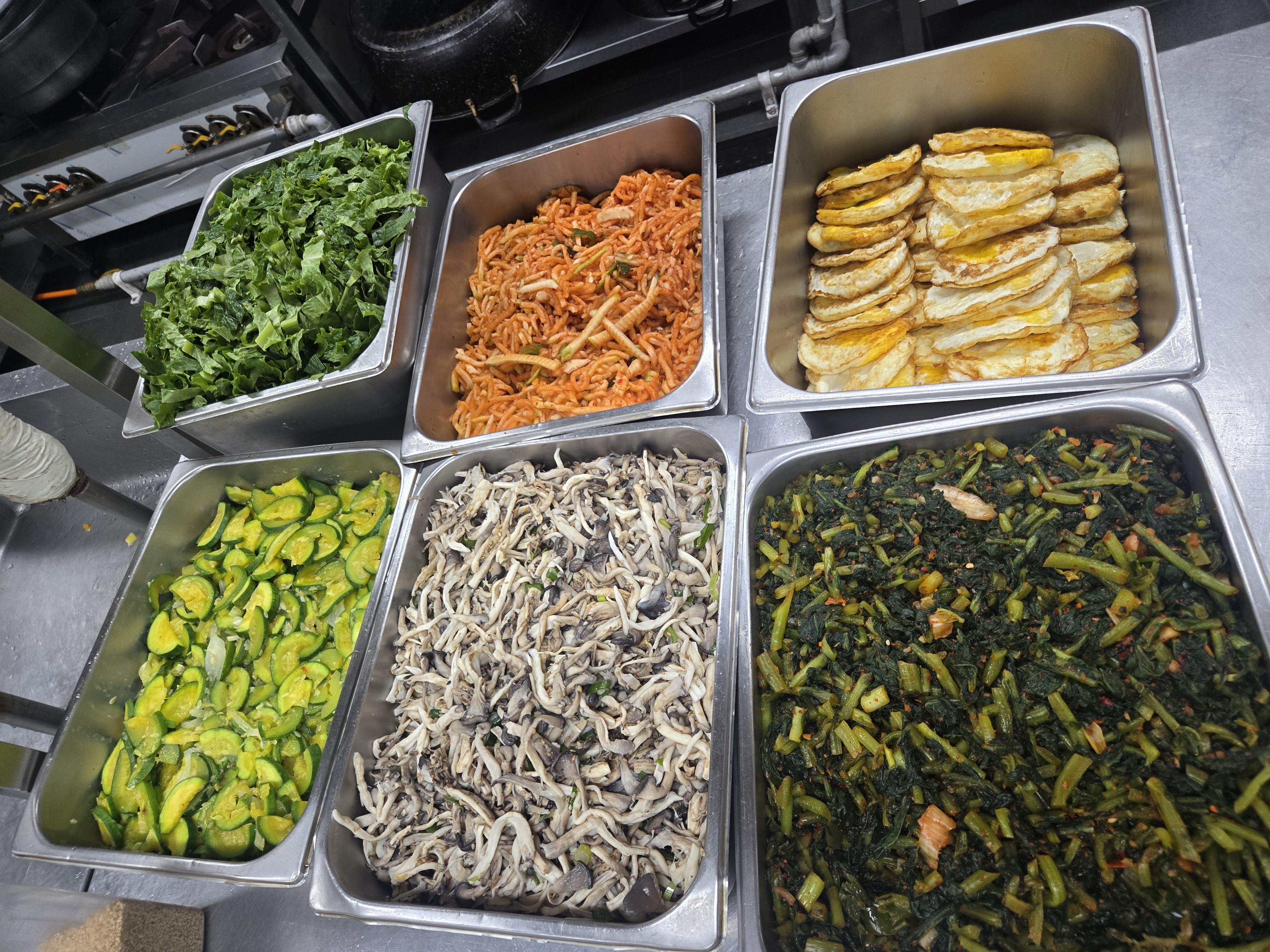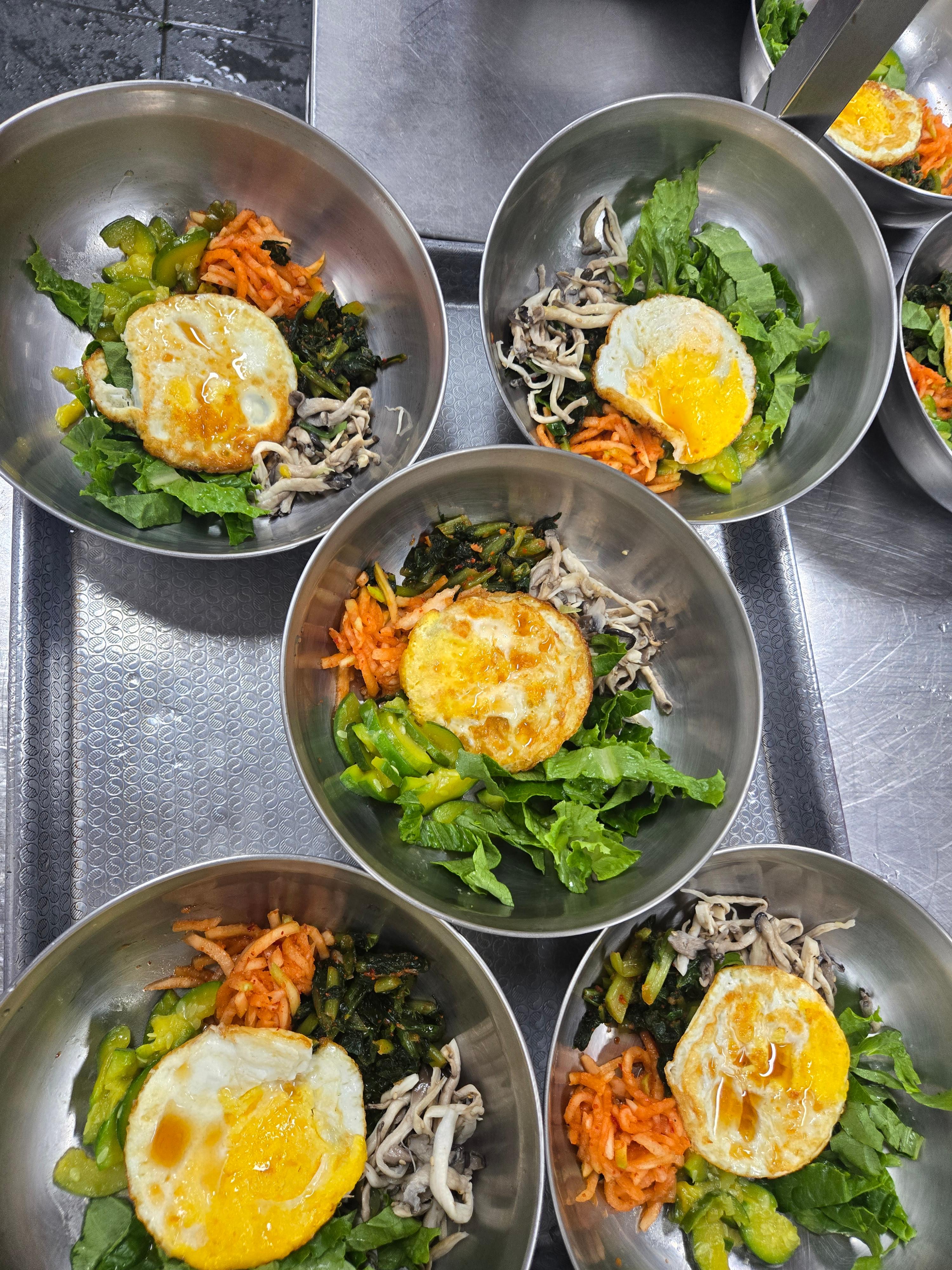 - 밥 위에 각각의 나물을 원형으로 돌려 담고, 가운데 계란을 올립니다.
