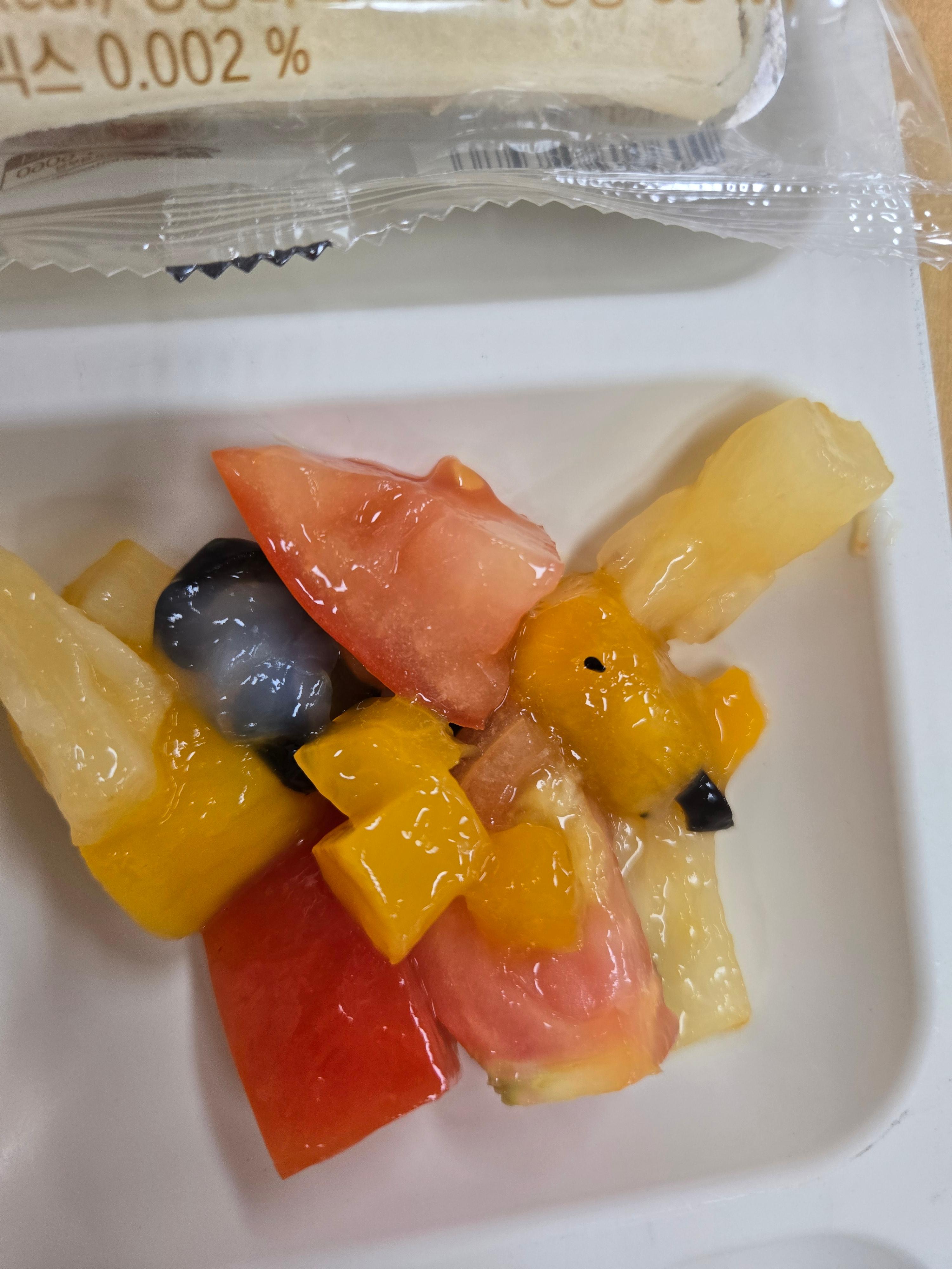 - 냉동과일이라 먹기직전에 세팅하는것이 좋지만 어르신들이라 상온에 살짝 둔 후 제공했습니다 토마토가 남아있어서 토마토를 섞어서 제공했더니 오히려 색이 더 예뻤어요 🌿