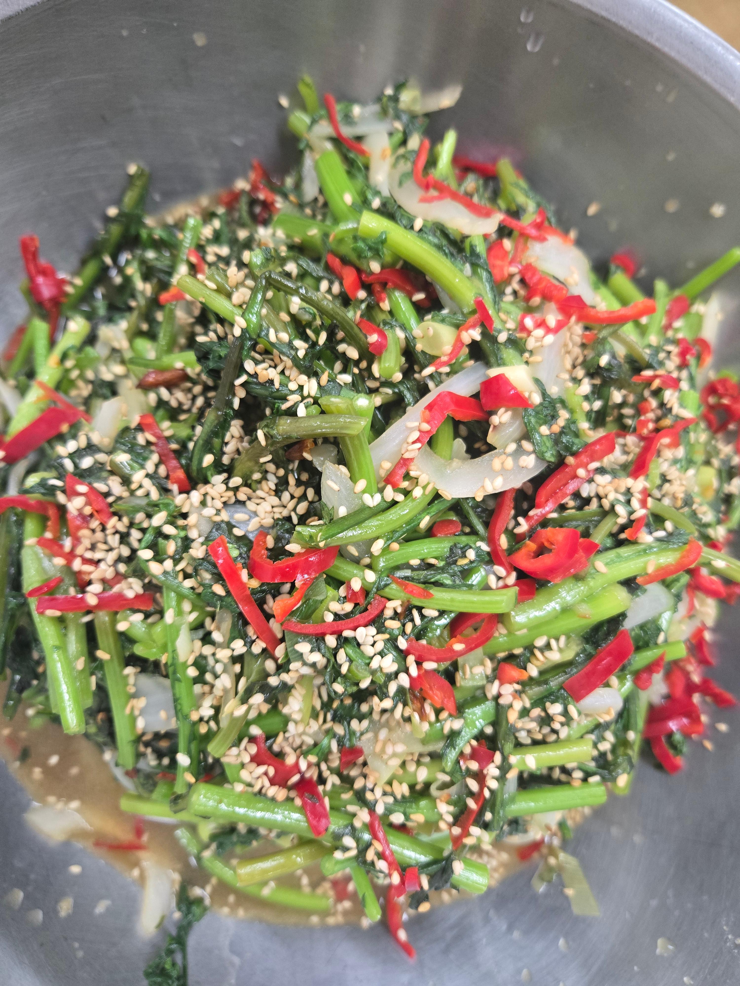 - 치킨스톡 멸치액젓 굴소스로 간을 맞추고, 깨소금을 넣어 마무리합니다.