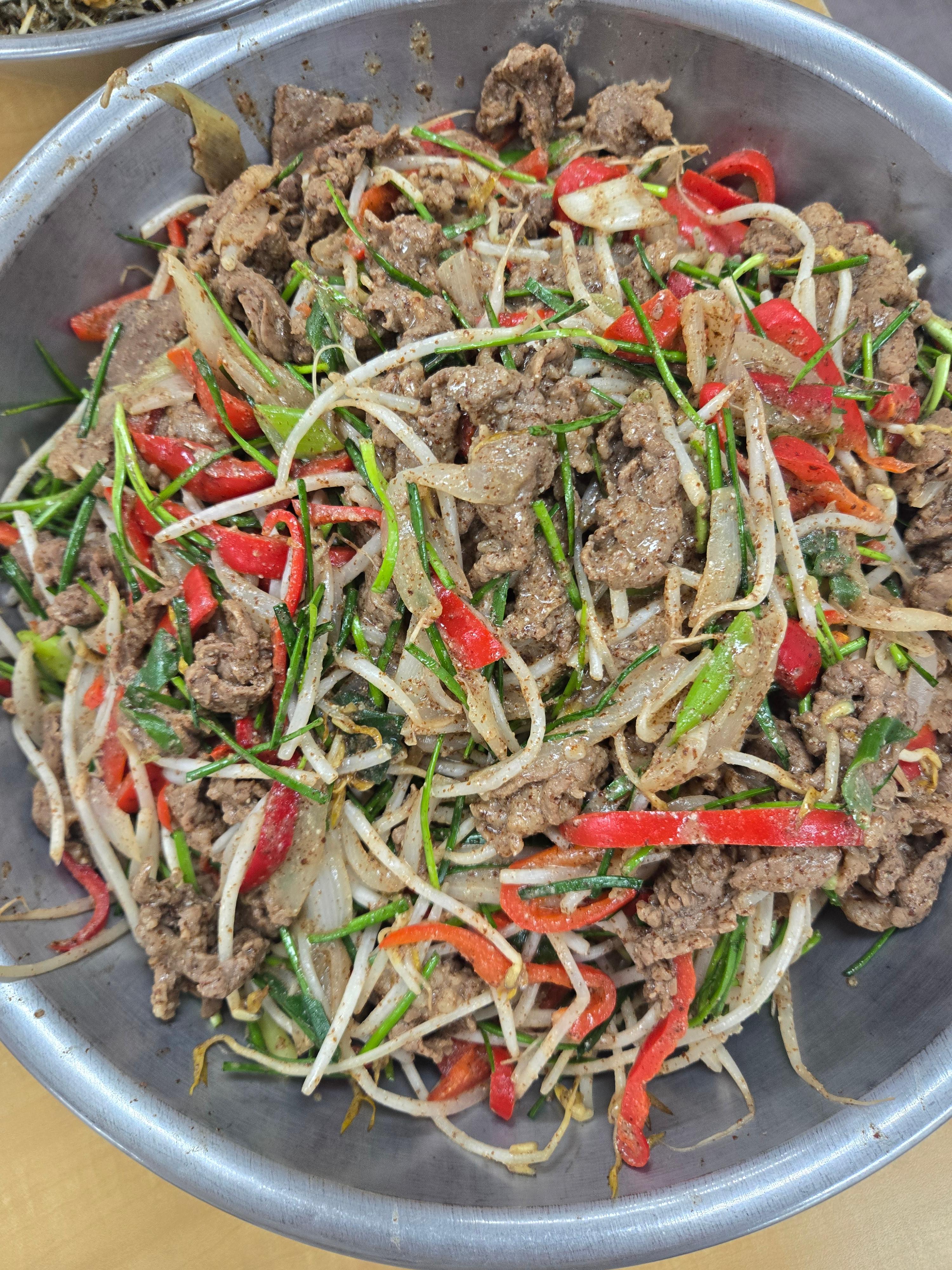 2. 야채는 별도로 볶은 후 차돌과 섞은 후 들깨가루와 볶아줍니다