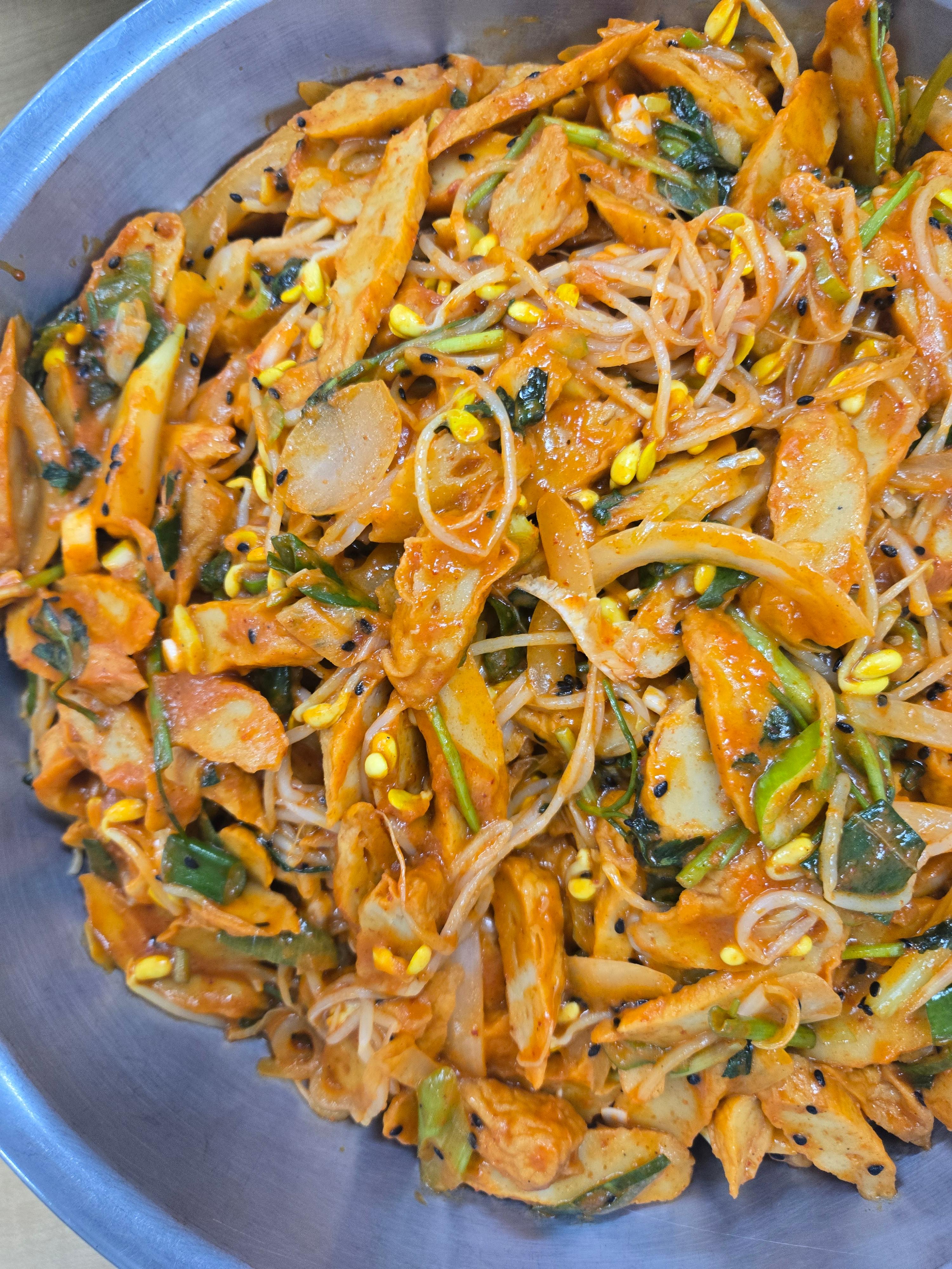 쫄깃한 어묵과 아삭한 콩나물의 만남! 국물 없이도 촉촉하게, 입에 착 달라붙는 매콤달큰 찜요리.